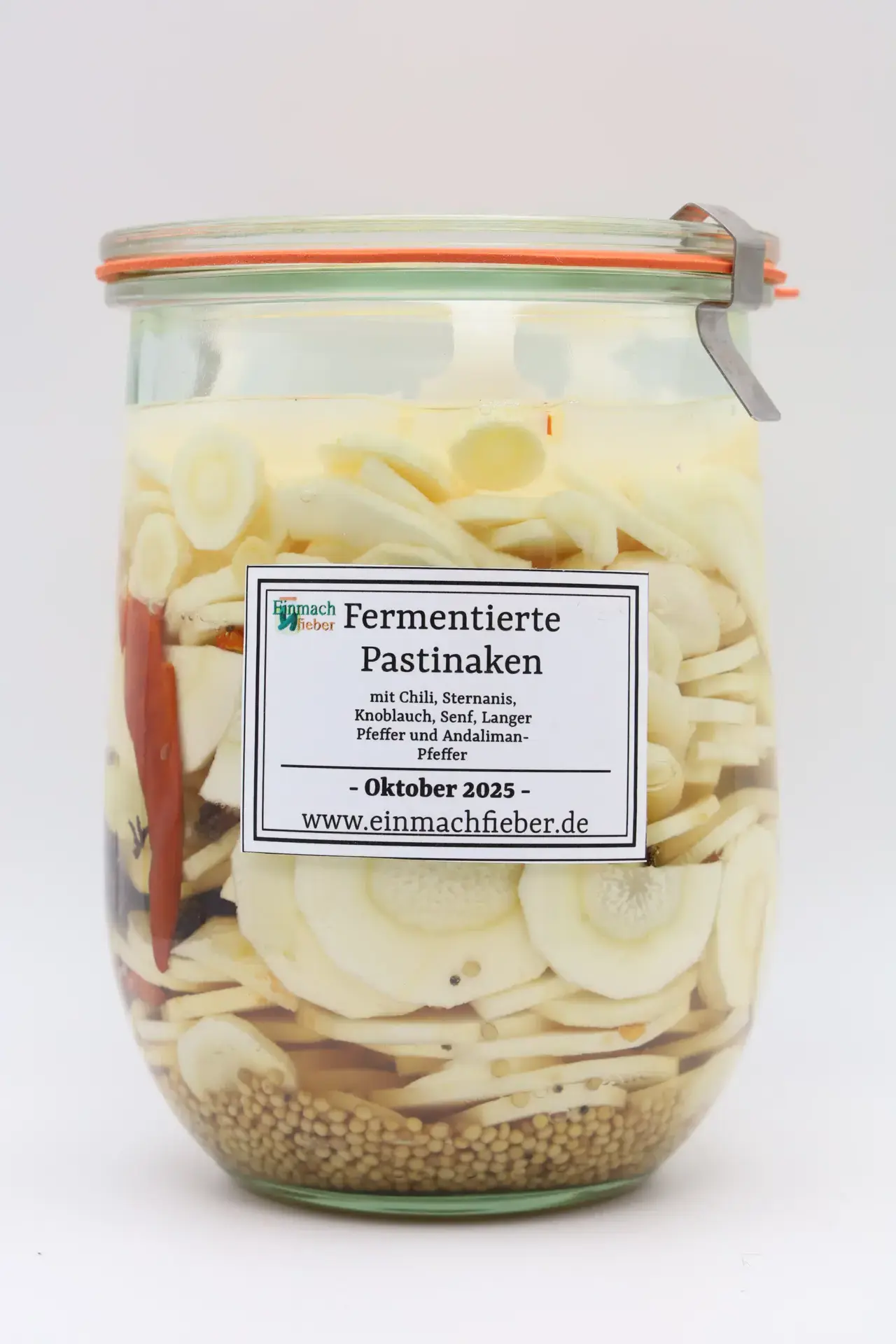 Pastinaken in das Glas schlichten, Gewürze im unterem Drittel mit rein geben, Chili seitlich rein stecken.